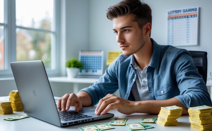 Seorang dewasa muda duduk di meja kerja dengan laptop dan tumpukan uang kecil serta tiket lotre, tampak fokus menganalisis data di ruangan kantor rumah yang terang.