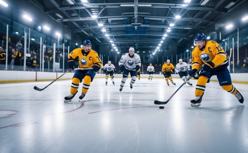 Pertandingan hoki es yang intens dengan pemain yang sedang bermain di arena dalam ruangan dan penonton di latar belakang.
